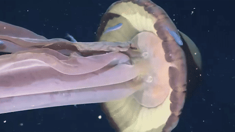 Stygiomedusa gigantea is the scientific name for the giant phantom jellyfishStygiomedusa gigantea is a type of deep-sea jellyfish that has only been seen around 100 times since its discovery in 1899.Scientists did not even recognise this type of jellyfish as a species until 60 years after it was discovered due to the infrequent sightings.This species has been observed and filmed off the Pacific coast of the United States,off the coast of Japan,and in the Gulf of Mexico.Although very little is known about how the jellyfish survives,it is assumed they feed on plankton and small fish.It is not the biggest jellyfish in the ocean,but its bell (the main part of a jelly’s body) can be more than a meter wide.Giant phantom jellyfish have oral arms rather than the stinging tentacles typically associated with jellyfish,which they use to grab onto their prey and guide it towards their mouths.Before underwater robots were invented,experts used trawling nets to study deep-sea creatures like the giant phantom jellyfish.When one is captured and brought to the surface,researchers said its silky-looking frame turns to ‘gelatinous goo’.This means that the use of underwater robots is the best way to observe the species and learn more about them.The Monterey Bay Aquarium Research Institute (MBARI),a separate research organisation,says their ROVs have done a ‘thousand of dives’ but have only seen the giant phantom jellyfish species nine times.